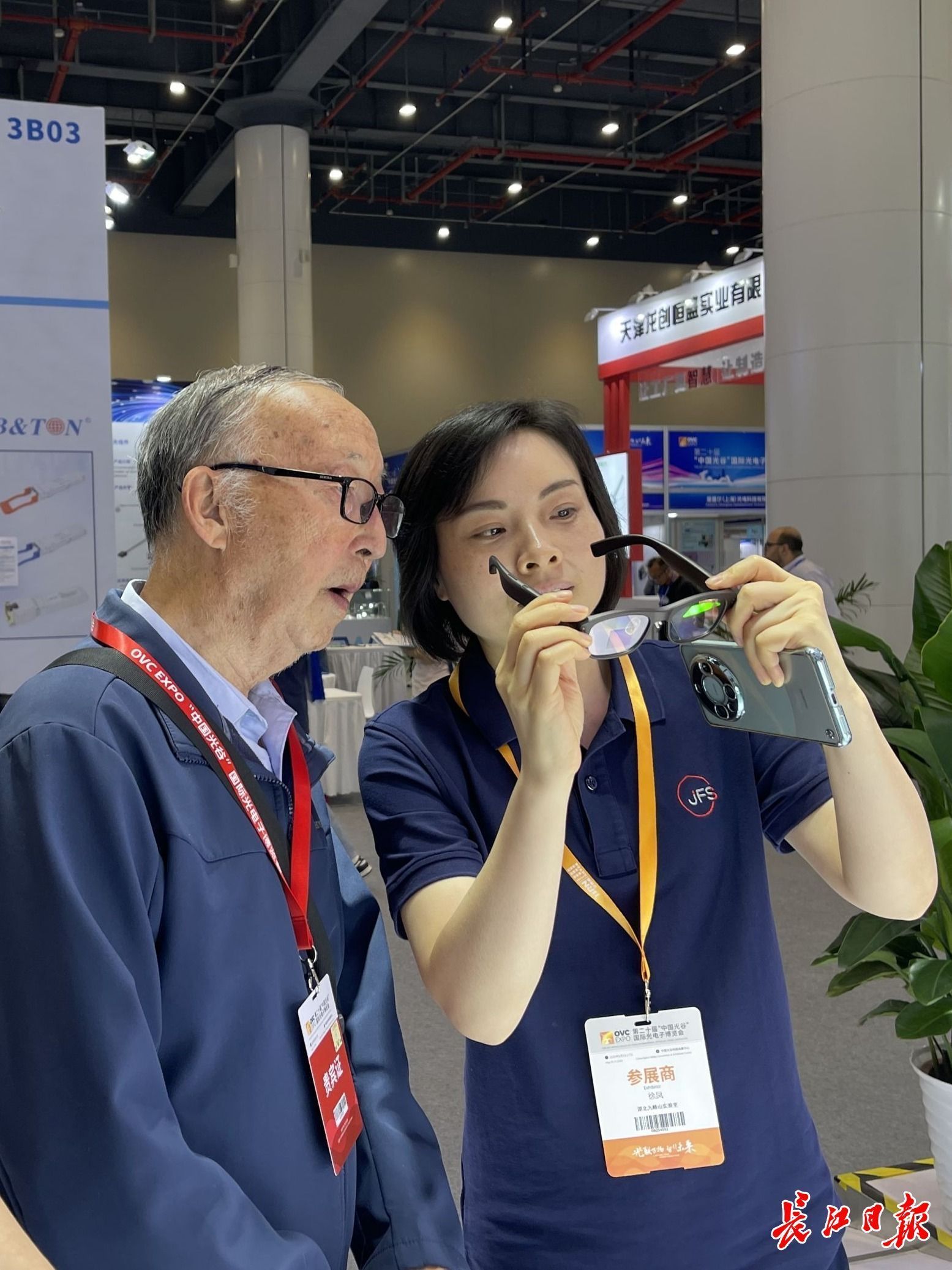 第二十届光博会九峰山实验室展位,搭载氮化镓芯片的ai眼镜引起了殷鸿福院士(左二)的注意。记者李佳 摄