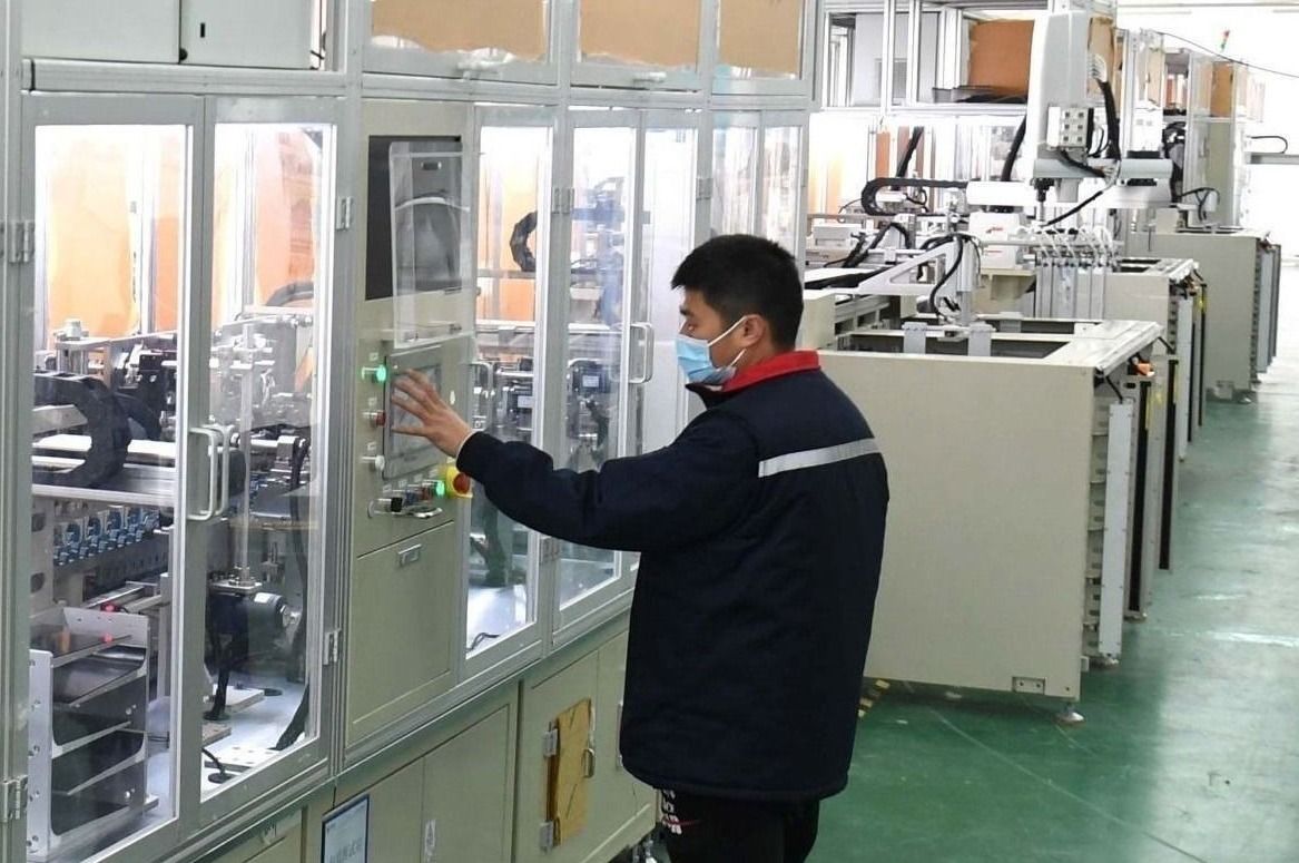 武汉逸飞激光股份有限公司技术人员在操作自主研发的全极耳电池生产线。
