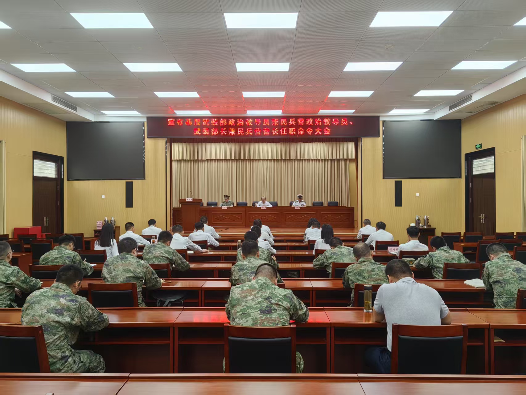 6月3日,全市基层武装部政治教导员兼民兵营政治教导员、武装部长兼民兵营营长任职命令大会召开。市委书记、市人武部党委第一书记何洪涛出席会议并讲话。市委常委、人武部部长吴照柱宣读了任职命令,并为新任职武装部长授予专职人民武装干部标志符号。