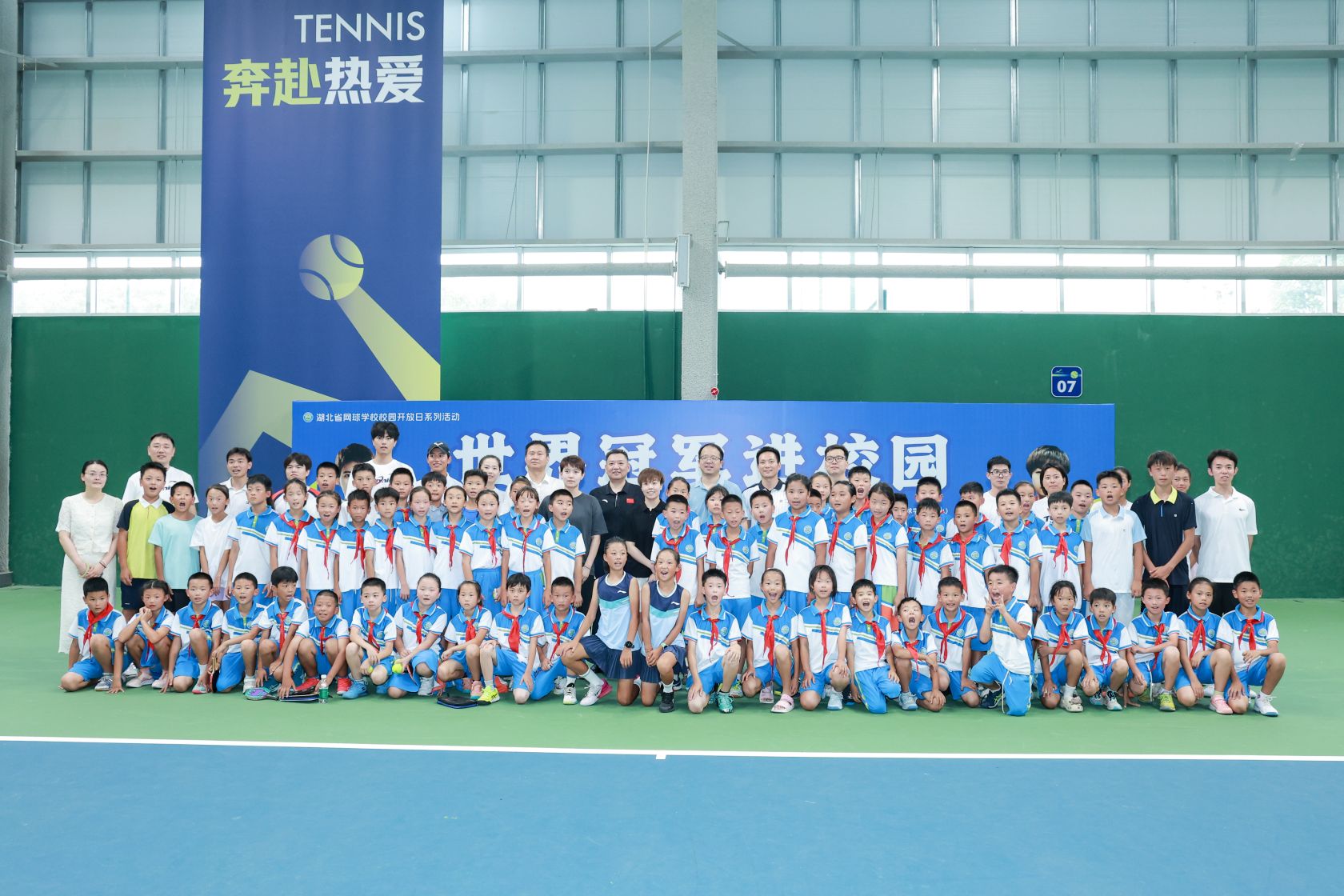 活动中,张瑞、杜玥与网球学校学生面对面交流,逐一回答学生提问,并与学生们亲密合影。通过与冠军“零距离”地接触,不仅提升了学生们的球技,更加激活了对体育运动的热情。
