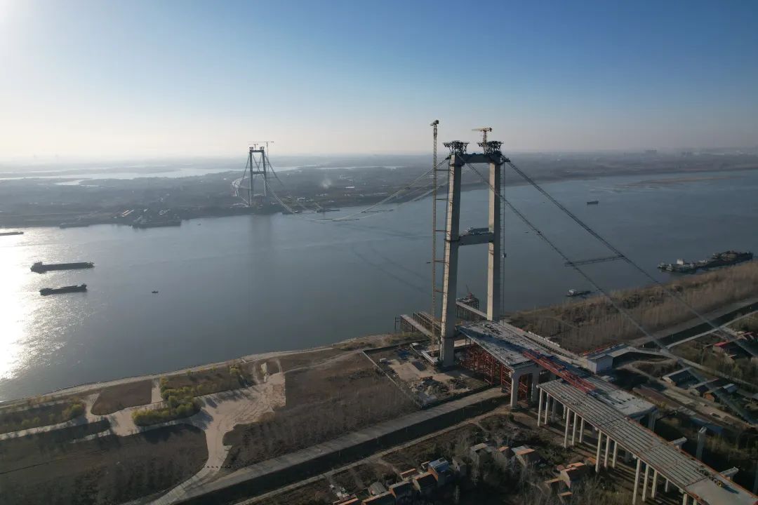 湖北省第40座武汉市第12座长江大桥——武汉双柳长江大桥猫道日前全线贯通标志着大桥进入主缆架设阶段进度条,百分之86新港高速公路双柳长江大桥及接线工程是国家高速公路网规划的g9906武汉都市圈环线重要...