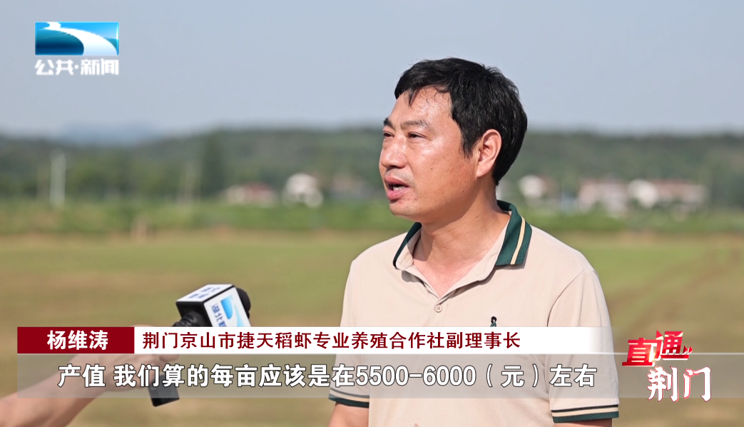 荆门京山市捷天稻虾专业养殖合作社副理事长 杨维涛:“产值,我们算的每亩应该是在5500-6000(元)左右,比农户没有流转之前农户种的话每亩增加差不多是2000块钱左右。”
