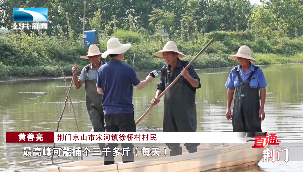 荆门京山市宋河镇徐桥村村民 黄善亮:“最高峰可能捕个三千多斤(每天),这两天是尾声了,尾声可能搞个五六百斤、六七百斤不等,虾子收完了以后我们种水稻,水稻品种是洋西早我们的稻谷是两块多钱一斤,其它的水稻、杂交水稻只有一块二三。”