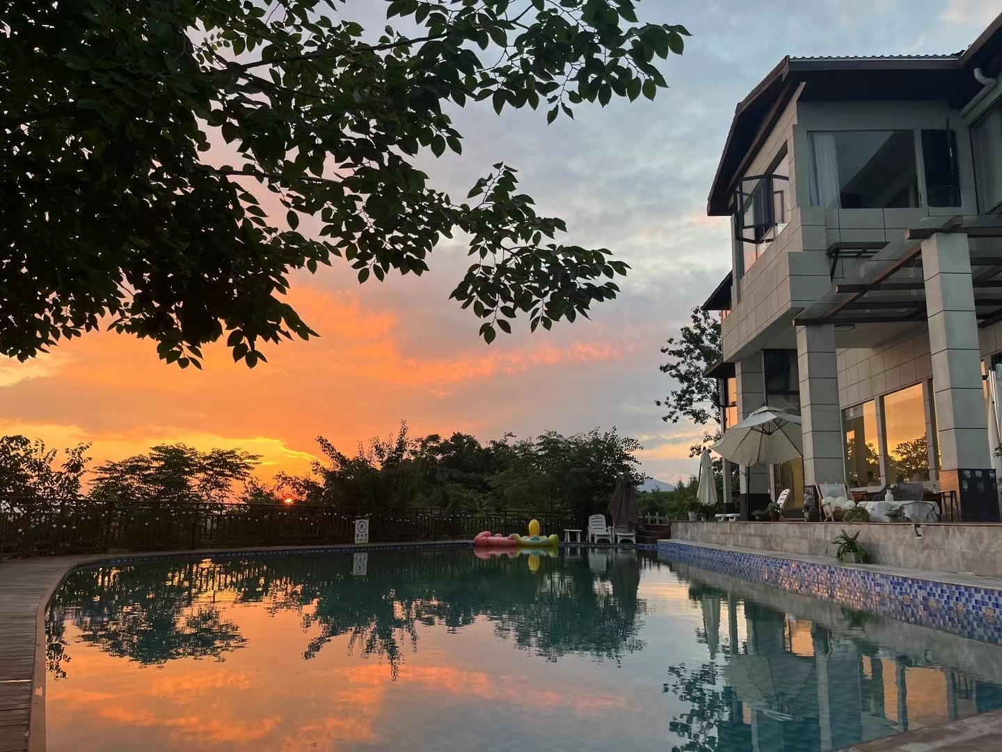阳光从三面落地窗洒进大厅,角落里摆着精致的小物件。窗外,清澈的游泳池和湛蓝的天空正好“登对”。池边,立着手机直播支架,镜头里村头的山岚和稻田“触手可及”。