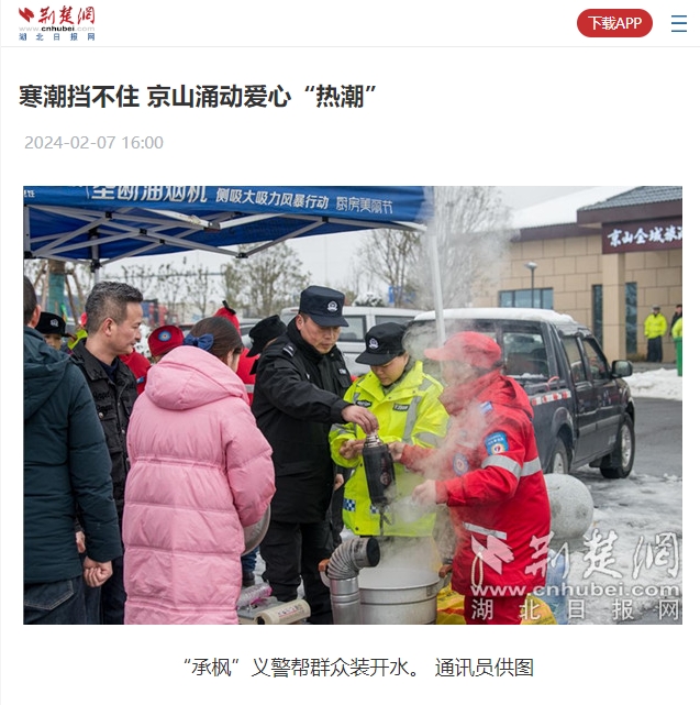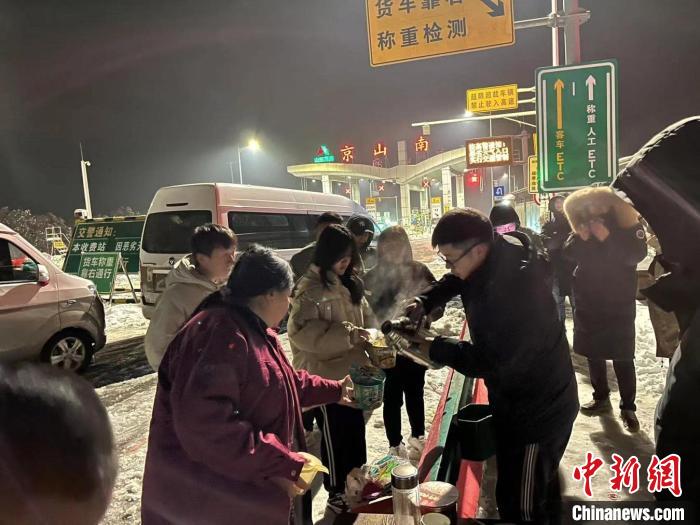“承枫”义警帮群众装开水。 通讯员供图京山市公安局民辅警和“承枫”义警为司乘人员发放泡面。 通讯员供图群众向民警道谢。 通讯员供图荆楚网(湖北日报网)讯(通讯员 杨怡)“师傅们,高速路口有免费的热水、