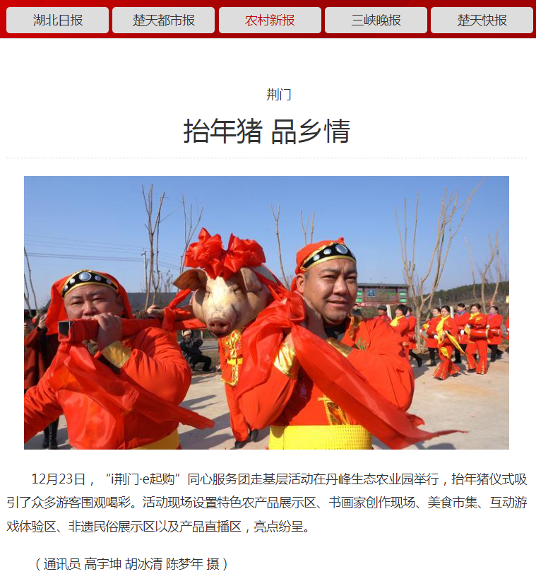12月23日,“i荆门·e起购”同心服务团走基层活动在丹峰生态农业园举行,抬年猪仪式吸引了众多游客围观喝彩。活动现场设置特色农k8凯发官网的产品展示区、书画家创作现场、美食市集、互动游戏体验区、非遗民俗展示区以及产