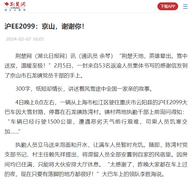 荆楚网(湖北日报网)讯(通讯员 余琴)“荆楚天地,英雄辈出。雪中送炭,温暖至极!”2月5日,一封来自53名返渝人员集体书写的感谢信发到了京山市石龙镇党员干部的手上。300字,纸短却情长,讲述着风雪途中