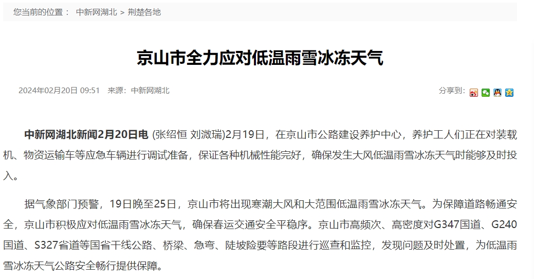 | 【中新网】京山市全力应对低温雨雪冰冻天气 |