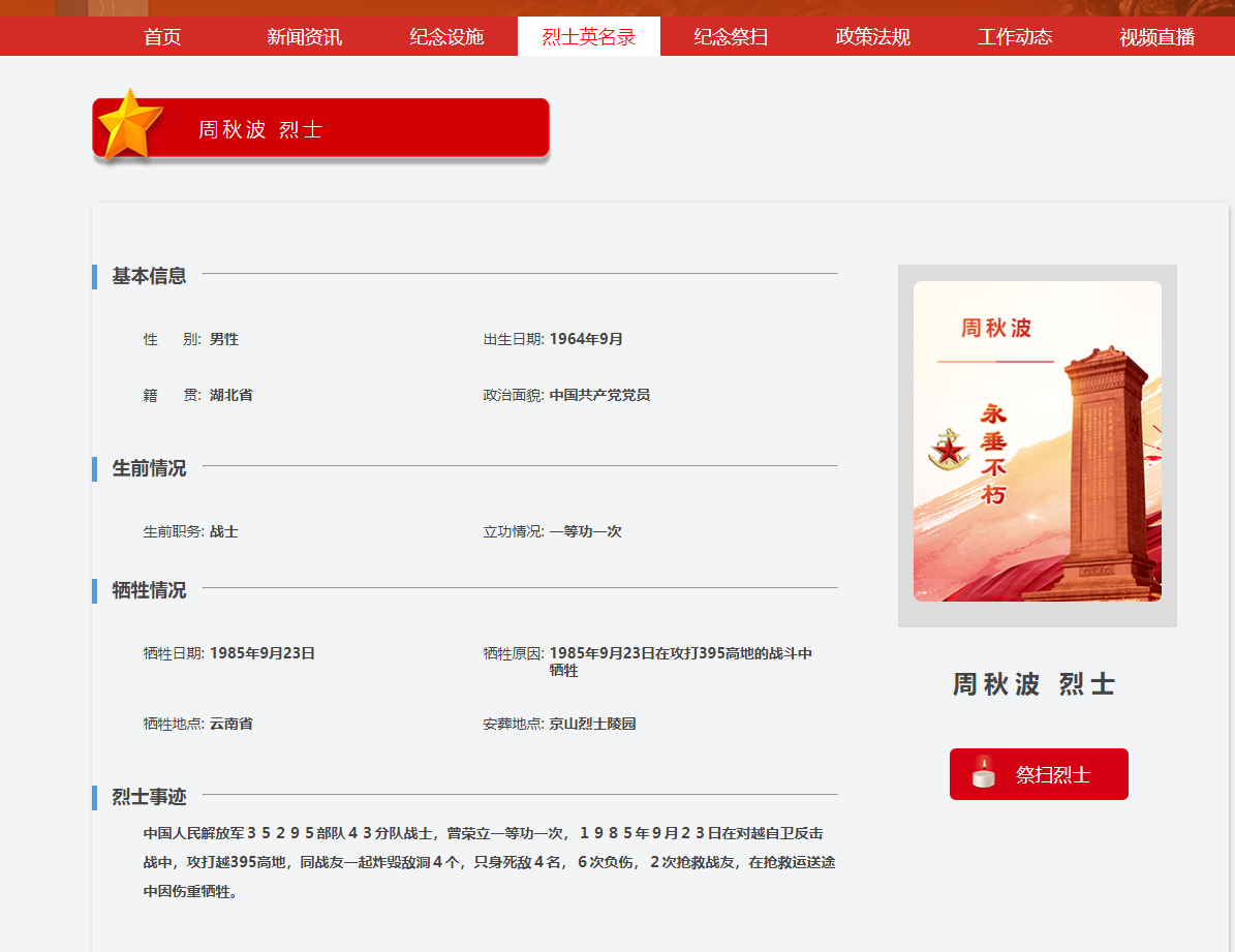 关于网络流传周秋波烈士不实信息的澄清声明 针对网络上出现的“对越自卫反击战中,周秋波烈士被俘”等不实报道、配图、视频,经过深入调查,现将相关情况声明如下:1.周秋波烈士系我市永兴街道老柳河村人,是我市