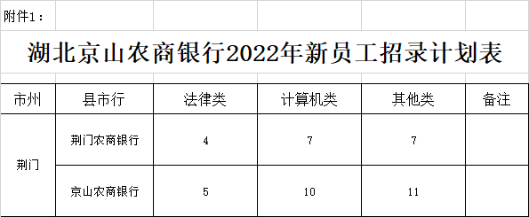 在湖北省农村信用联社统一安排部署下,全省农商行2022年新员工招录工作正式启动。湖北京山农村商业银行股份有限公司(以下简称“京山农商银行”)下辖22个营业网点,340多名员工,人民币存款、贷款总量在全