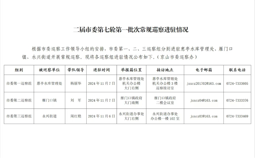 根据《中国共产党巡视工作条例》和中央、省委、荆门市委、京山市委关于巡视巡察工作的要求,按照市委巡察工作领导小组安排,于2024年11月6日至12月中旬,对惠亭水库管理处、雁门口镇、永兴街道开展二届