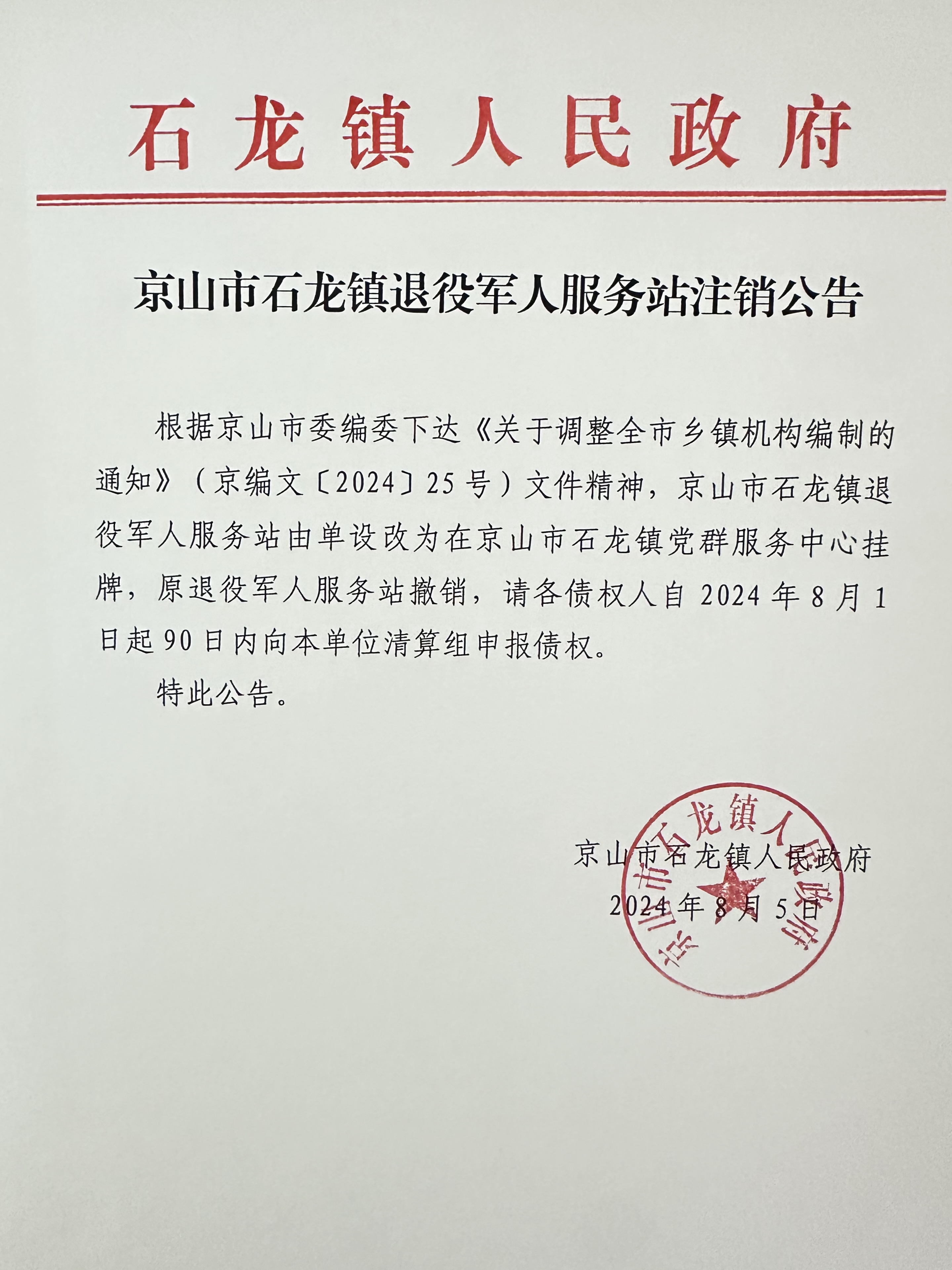 根据京山市委编委下达《关于调整全市乡镇机构编制的通知》(京编文〔2024〕25号)文件精神,京山市石龙镇退役军人服务站由单设改为在京山市石龙镇党群服务中心挂牌,原退役军人服务站撤销,请各债权人自202