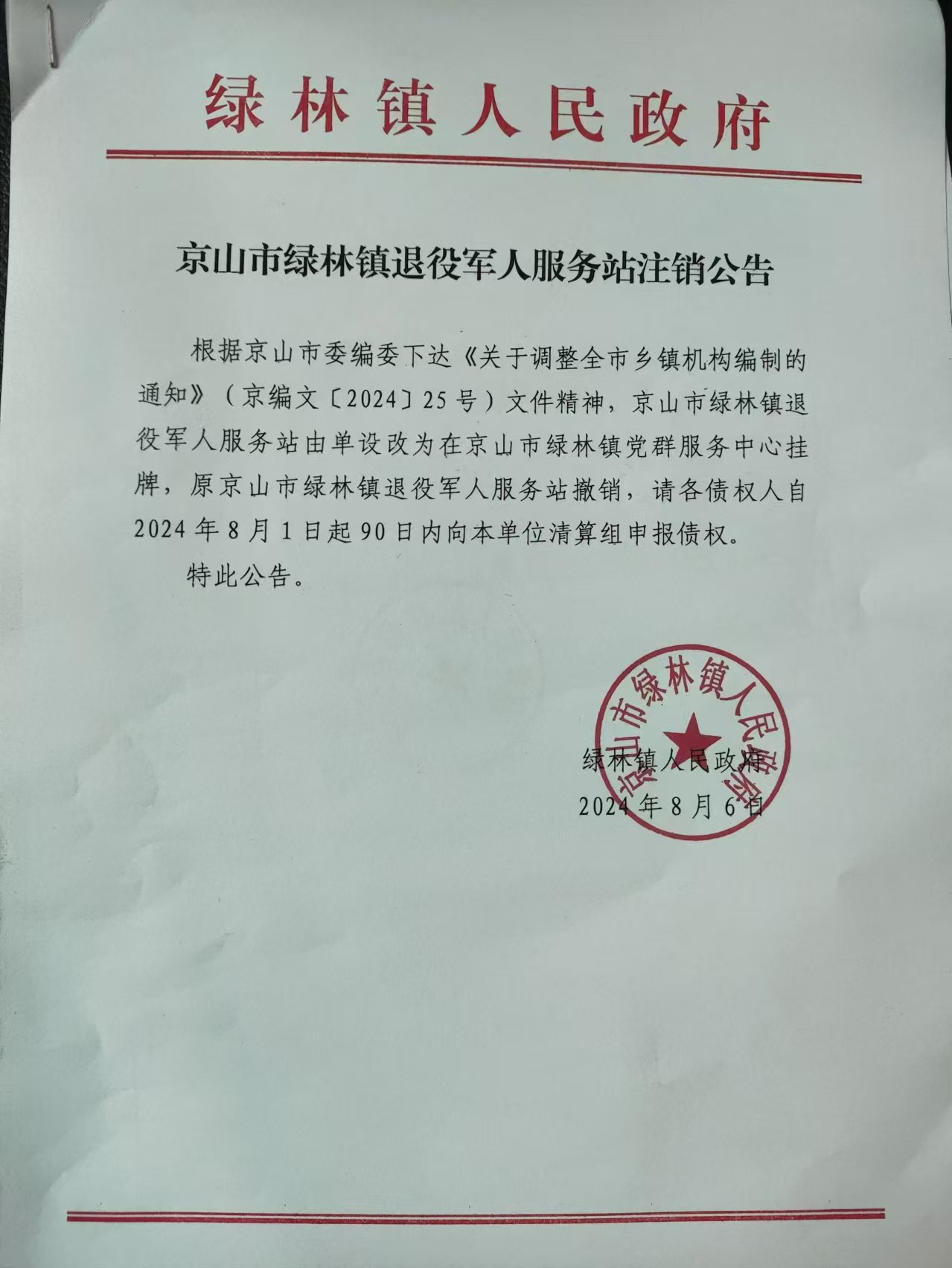根据京山市委编委下达《关于调整全市乡镇机构编制的通知》(京编文〔2024〕25号)文件精神,京山市绿林镇退役军人服务站由单设改为在京山市绿林镇党群服务中心挂牌,原退役军人服务站撤销,请各债权人自202