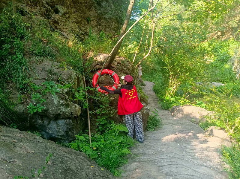 在大富水河沿岸,志愿者沿着河道巡逻,仔细排查每一处潜在的溺水风险点,默默守护着游客与村民的生命安全。