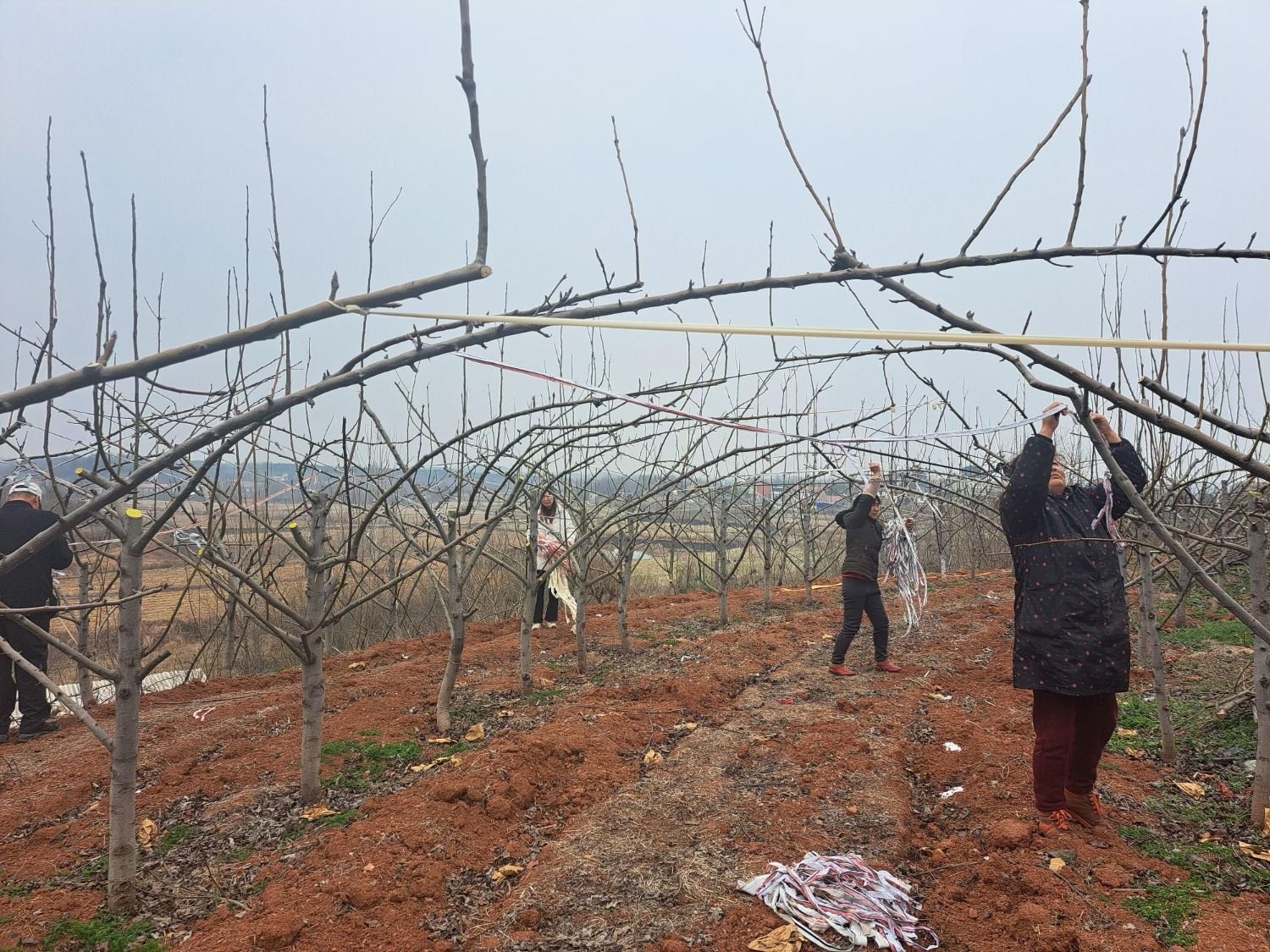 2月20日,罗店镇数十名工人分散在梨园的各个角落,忙碌地进行着梨树的修剪、定型、松土施肥、浇水和清理杂草等工作。