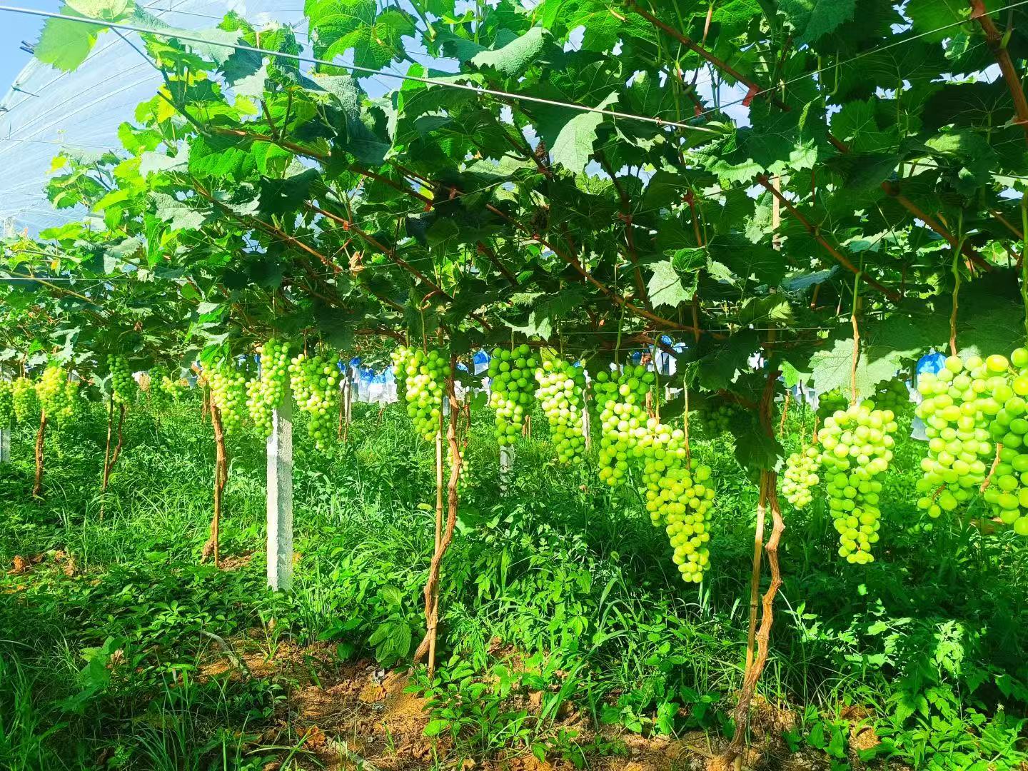 目前,葡萄园里的阳光玫瑰长势喜人,一串串青绿色的葡萄挂满枝头,预计7月中旬即可成熟上市。(朱睿欣 王方)