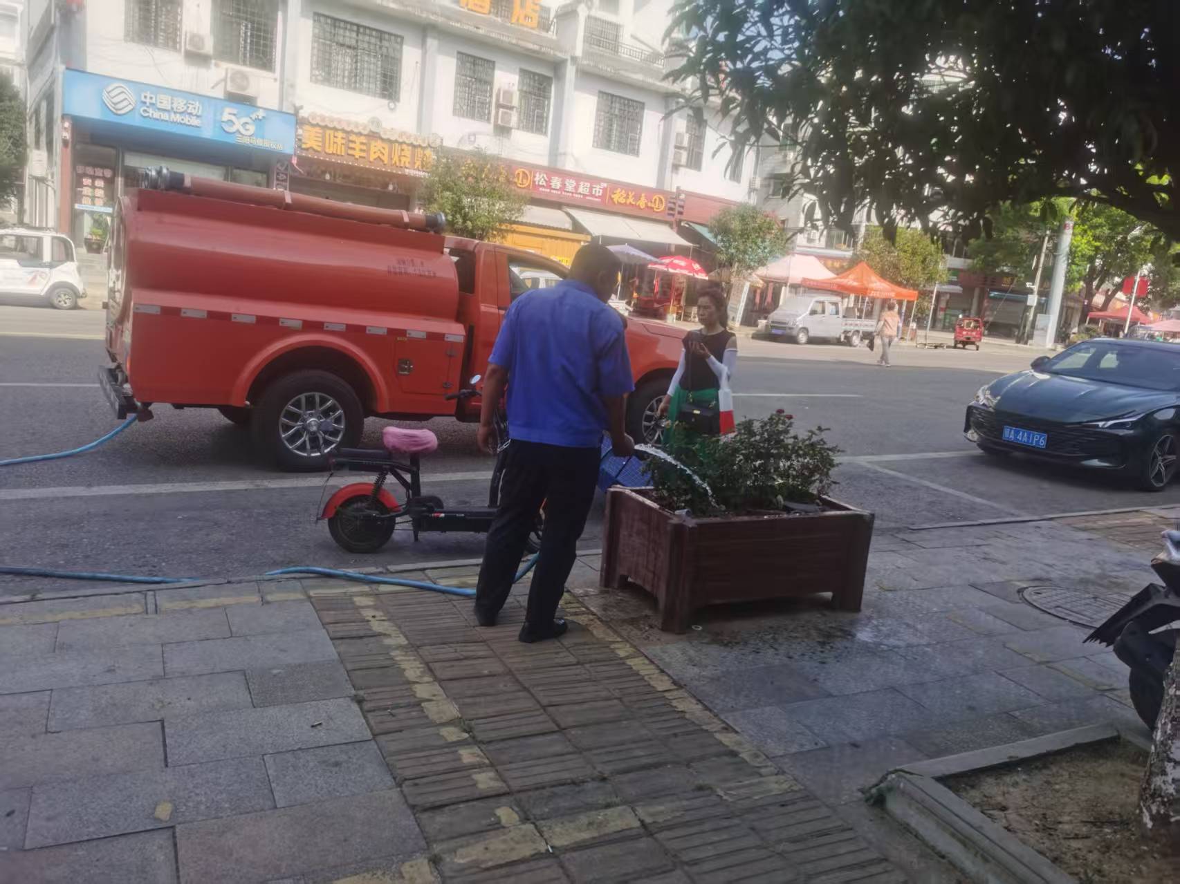 7月16日,三阳镇组织20余名园林养护人员及2辆洒水车开展绿化花圃抗旱浇水作业,守护城镇绿色生态。