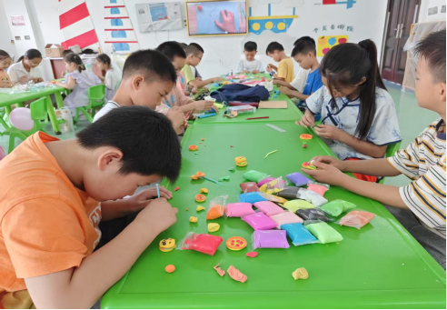 黏土制作课上,孩子们兴致高昂,充分发挥想象力与动手能力,一个个生动形象的小动物、精致逼真的“菜品”陆续诞生。志愿者们通过设置小奖励的方式,不断鼓励孩子们大胆创作,课堂上充满了欢声笑语。两个小时的课程结束后,展台上摆满了形态各异的作品——憨态可掬的小狗、晶莹剔透的水果、带着“笑脸”的小书包,每一件都充满了童真与巧思。
