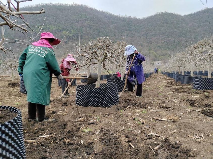 在培育基地里,村民们分工协作,有的挥锄铲土,为对节白蜡盆景植株加固培土。有的则在专业人员指导下,精心修剪枝条,塑造优美造型。