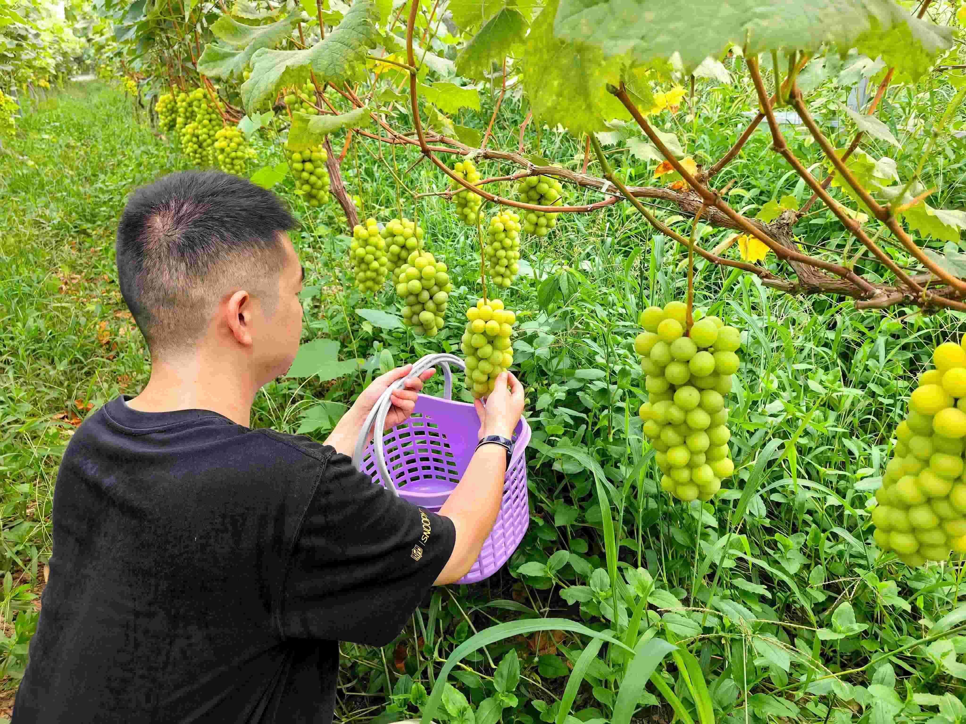 7月15日,走进新市街道四岭村京玉葡萄采摘园,一串串成熟的葡萄缀满枝头,吸引众多游客前来体验采摘乐趣。