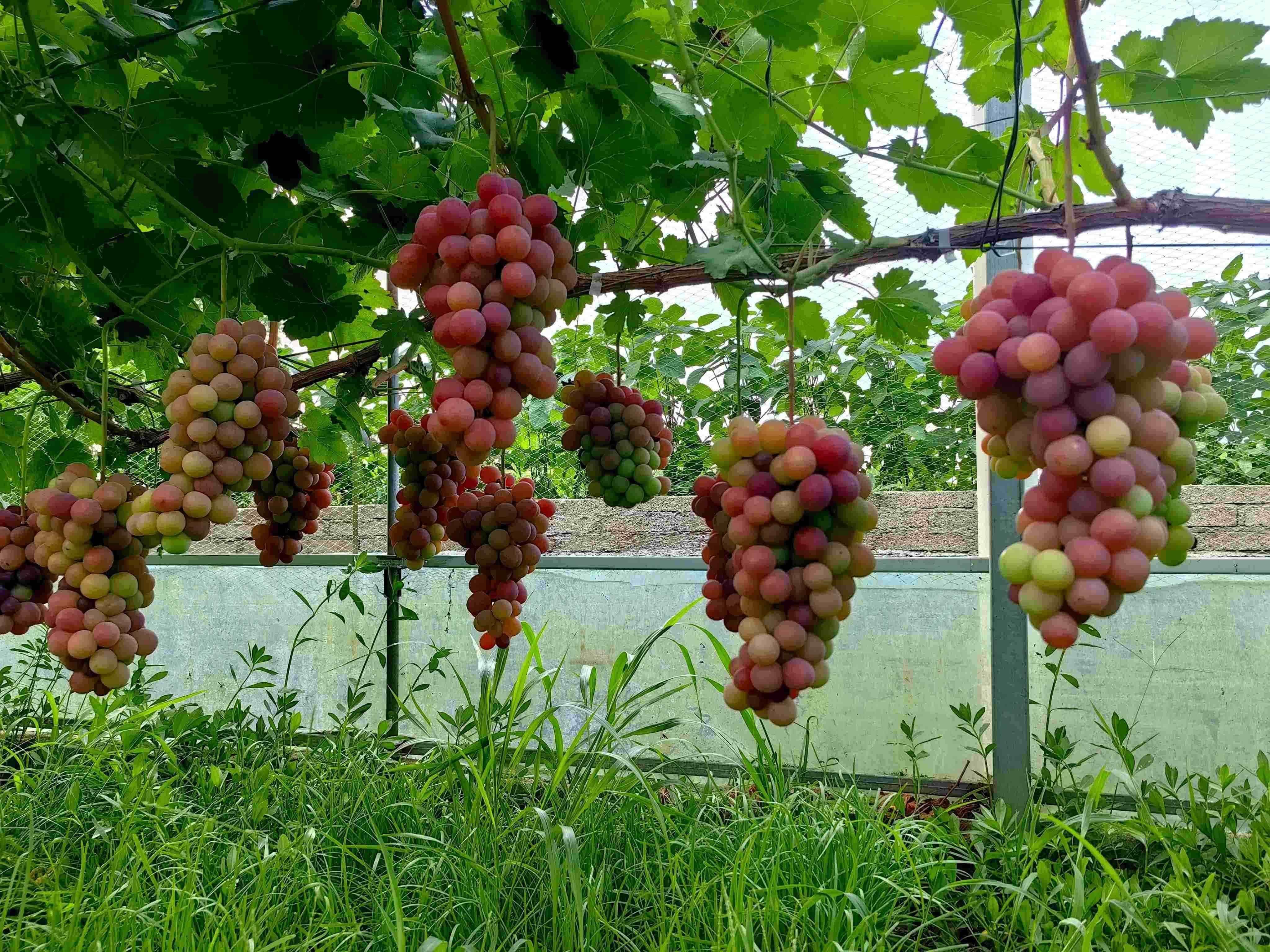 目前,采摘园内的部分阳光玫瑰、金手指、玫瑰香等品种已成熟上市。游客们手持工具,在葡萄架下细心挑选,剪下一串串葡萄,感受采摘的乐趣。