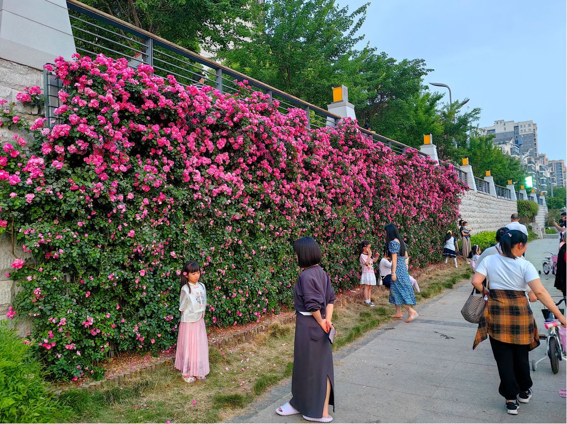 近日,位于京山河河畔的蔷薇花悄然盛放,一朵朵蔷薇垂下枝头,形成了花瀑。不少市民特意前来赏花拍照、开展短视频创作。