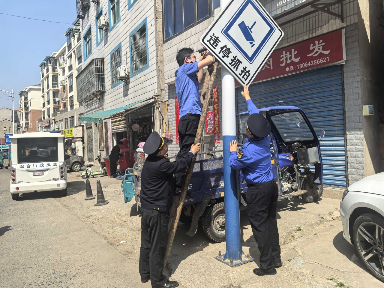 3月24日上午,新市街道综合执法中心队员在日常巡逻中发现,绿林路阳光丽苑路段的一处交警违停拍照警示牌随风晃动,摇摇欲坠,存在安全隐患。
