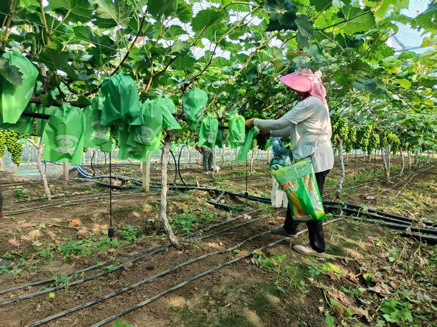 “一班”套袋,为果实披上“防护服”。在园内,工人们穿梭于藤架之间,动作娴熟地将特制纸袋套住每一串青翠的果实。这层“防护服”不仅能有效隔绝虫害侵扰、降低农药残留,更能使果实着色更均匀、果粉更完整,显著提升外观与口感,是阳光玫瑰保持良好品质不可或缺的关键步骤。