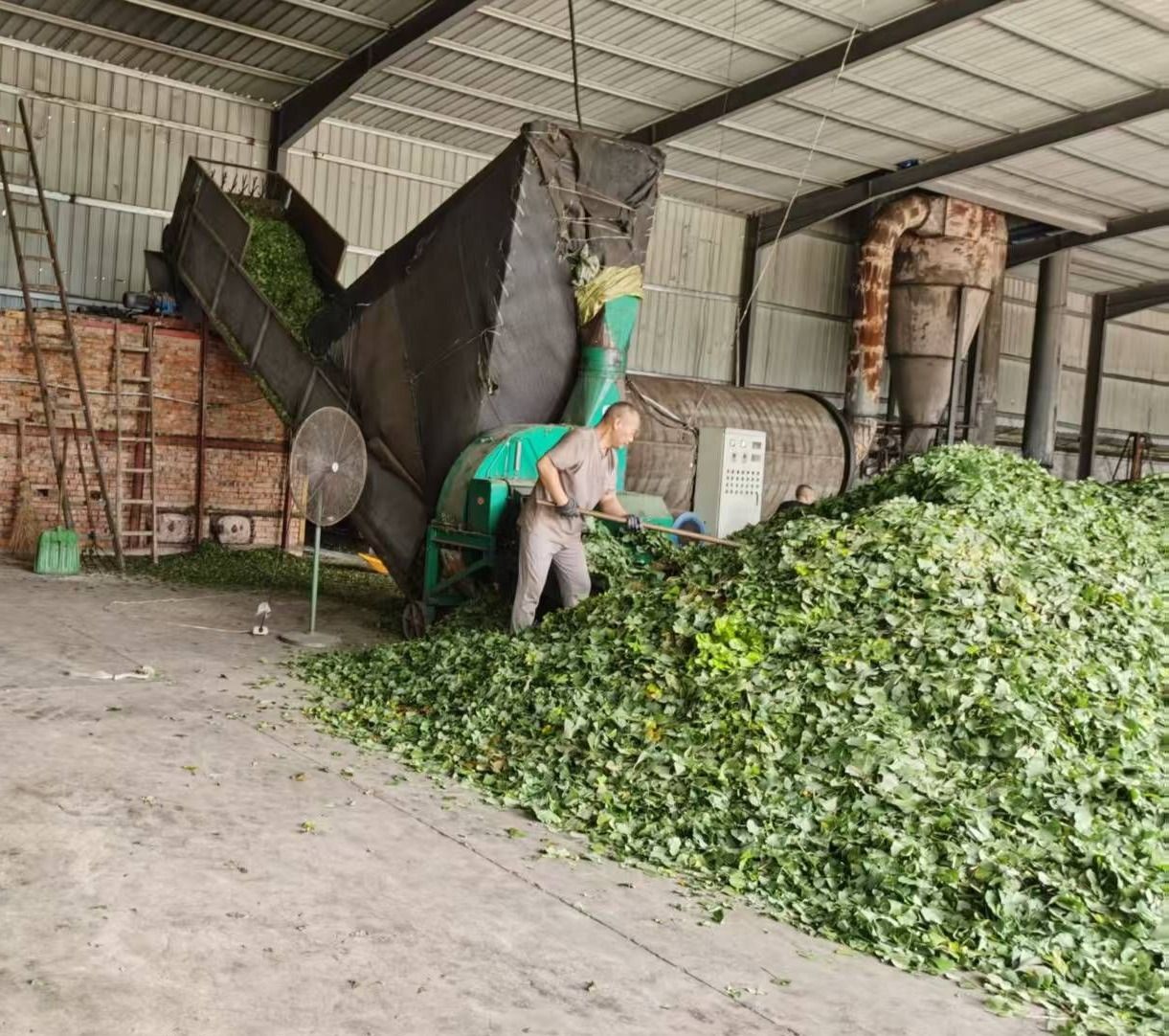 7月23日,杨集镇卢棚村股份经济合作社银杏加工厂房内机器声隆隆,工人们正忙着将一筐筐新鲜的银杏叶送入机器中,进行脱水加工。经过这一工序,银杏叶便华丽转身,变成了农户们眼中的“黄金叶”。