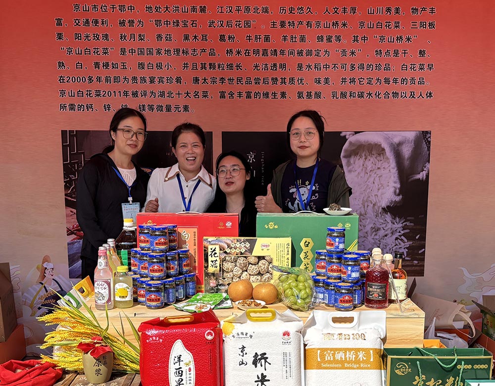“京山桥米是中国国家地理标志产品,不仅是湖北省首个食品类中国名牌,还是首个中国驰名商标。因原产于京山市孙桥镇而得名,其颗粒细长、晶莹剔透,在明嘉靖年间被御定为‘贡米’,不仅外观上粒粒饱满、光亮,内质上更是富含蛋白质,氨基酸等多种营养物质。”在特色农副产品京山展示展销区,工作人员正在详细地给来参观的群众讲解展销产品。