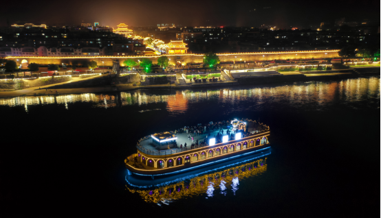 在汉江游轮上,“水上剧场”带来由襄阳本土文化典故改编成的《汉水女神传说》歌舞剧,与“郭靖黄蓉”真人秀等节目相结合,让游客在桨声灯影中触摸襄阳的古典浪漫。